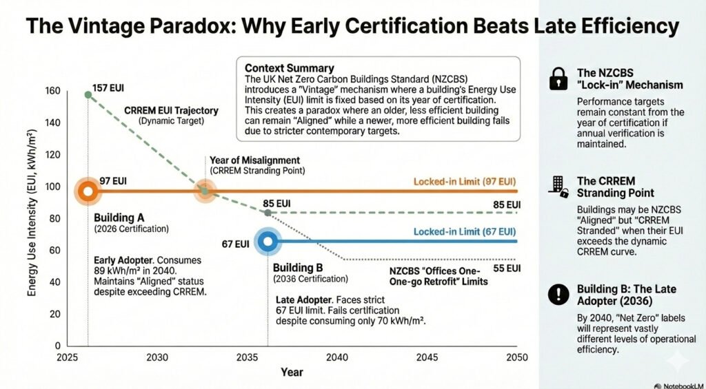 Consider a narrative involving two identical office buildings on the same street. Building A (The Early Adopter) achieves NZCBS verification in 2026 and is locked into a limit of 97 kWh/m²/year. By 2040, it consumes 89 kWh/m²/year and retains its Net Zero Carbon Aligned status. Building B (The Late Adopter) with actual operational performance of 67 kWh/m²/year delays its intervention and seeks verification in 2036, at which point the limit has tightened to 67 kWh/m²/year. Even if Building B operates at a highly efficient 70 kWh/m²/year in 2040 (making it far more efficient than Building A), it will fail to achieve the Net Zero label because it missed its specific 2036 vintage target (NZCBS, 2026).